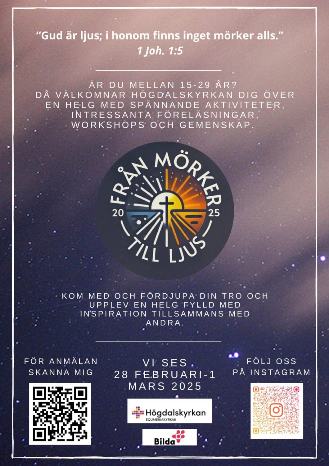 Vi på Högdalskyrkan har glädjen att bjuda in era ungdomar till en ungdomskonferens med temat Från mörker till ljus. Under denna helg vill vi tillsammans med ungdomar från olika församlingar utforska vad det innebär att hitta ljus och hopp genom gemenskap och tro. Konferensen äger rum fredag 28 februari och lördag 1 mars i Högdalskyrkan och riktar sig till unga i åldrarna 15–29 år.